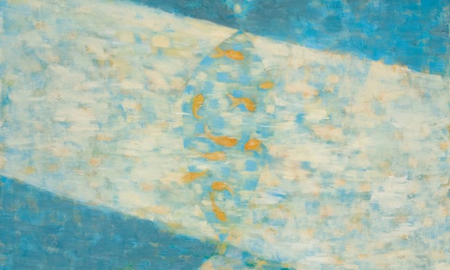 Composition I focuses on the goldfish that inhabit the palace ponds. Koi are symbols of love and affection in Japan, and this positive imagery is echoed in the bold, bright colours and in the fan shapes that are used in the composition, which also represent friendship, respect and good wishes. The fish swim freely in the heavenly banner of light that runs across the centre of the work.