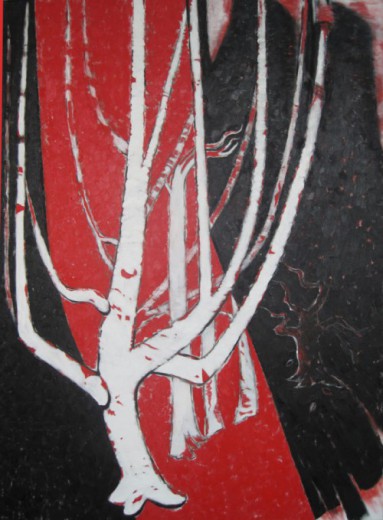 This work was created when I first moved to Singapore in 2007. The painting conjures a sense of sadness and loneliness, a reflection of the fact that it took me some time to adapt to my new surroundings, and is inspired by the Maya Angelou poem “The Caged Bird Sings”. The ethereal bird floating outside the cage tries to communicate the existence of freedom, love and companionship to the caged jade bird. The frame of the cage closest to the silhouetted bird is almost invisible, highlighted in a golden yellow, suggesting the freedom outside which the caged bird cannot see. The work also represents the wider oppression that exists in the world, and how it can be conquered, at least in part, by communication.