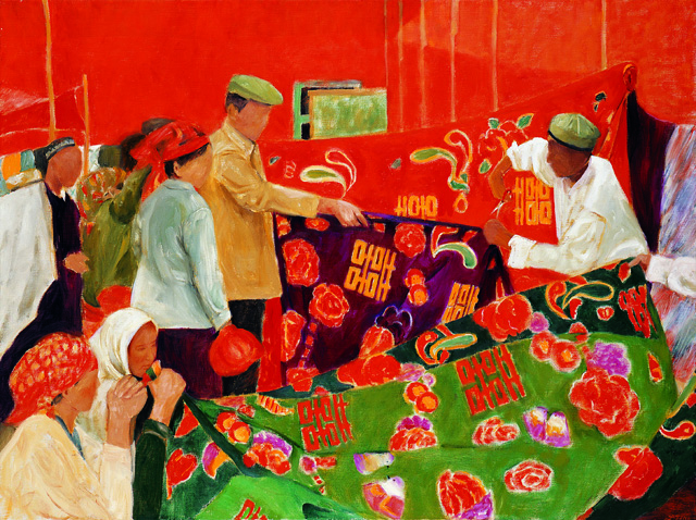 Highly coloured textiles with Chiinese ‘Double Happiness’ characters and roses for pattern are attracting the custom of local women.