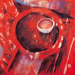 The life of the novice is intrinsically connected to the bowls that they use to seek food from door to door every morning before dawn. The novices then go back to their monastery where they sleep, study and share food with their fellow monks. This painting focuses on the importance of these bowls and learning within the novice community.