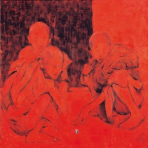 The life of the novice is very simple: they do not have modern day toys like most of the children around the world. Hence a simple game consists of whatever they can find. With their imagination, they play this game of who wins the metal ring they found. The boy in front is really happy that he is winning, the one on the right is really cross that he has lost but the one at the back is enclosed in his own little world, very contented with whatever happens.