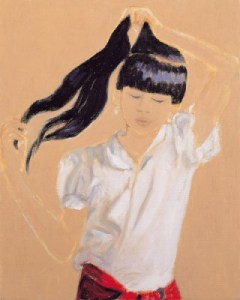 This beautiful young girl in Bagan has a heavy fringe all the way around her head and a bun on the top, which is very different from most of the women in the villages. Apparently before marriage, girls hiar are cut like this and once they are married they will have long hair tied up in a bun at the back instead of on top of the head. This painting was inspired by the purity of her simple elegance and the curve of her figure echoed by her black and wavy hair.