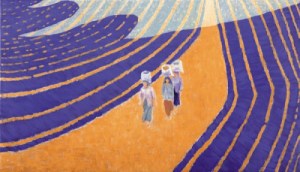The strong afternoon shadow brings these young girls back from the fields with heavy sacks on their heads The sun is half way down in the sky, which creates this strong contrast of light and shade on the fields.