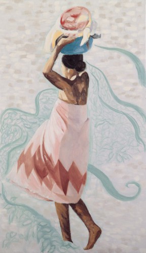 This is one of three panels that depict young village girls from Burma. This girl is from Bagan, a tranquil plain scattered with thousands of earth coloured pagodas and stupas. The young girl is carrying a bowl of food to her home, trekking along a beach littered with sprigs of grass amongst the sand. The grass flows out from her, signifying the gentleness of the Burmese people.
